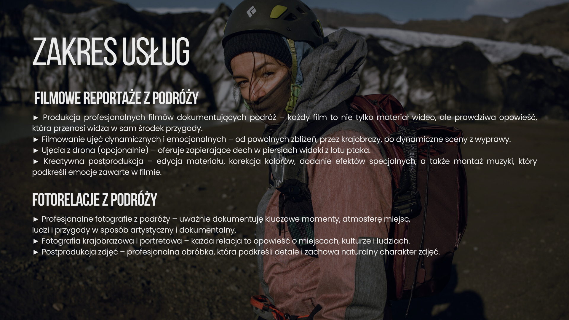 PRODUKCJA i POSTPRODUKCJA FILMOWA Tworzę dynamiczne reportaże, relacje z wydarzeń, materiały promocyjne oraz filmy dokumentujące wyprawy i projekty outdoorowe. Zajmuję się całym procesem powstawania materiału – od zdjęć filmowych, przez montaż i selekcję ujęć, aż po kolor korekcję oraz finalną formę filmu gotową do publikacji w mediach społecznościowych, na stronach internetowych czy platformach wideo.Moim celem jest tworzenie autentycznych i angażujących historii wizualnych, które oddają atmosferę wydarzeń i charakter miejsc, a jednocześnie pomagają markom wyróżnić się i budować silną obecność w świecie online.