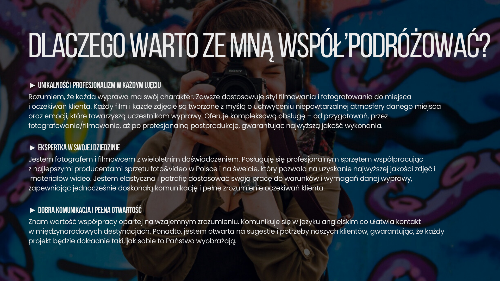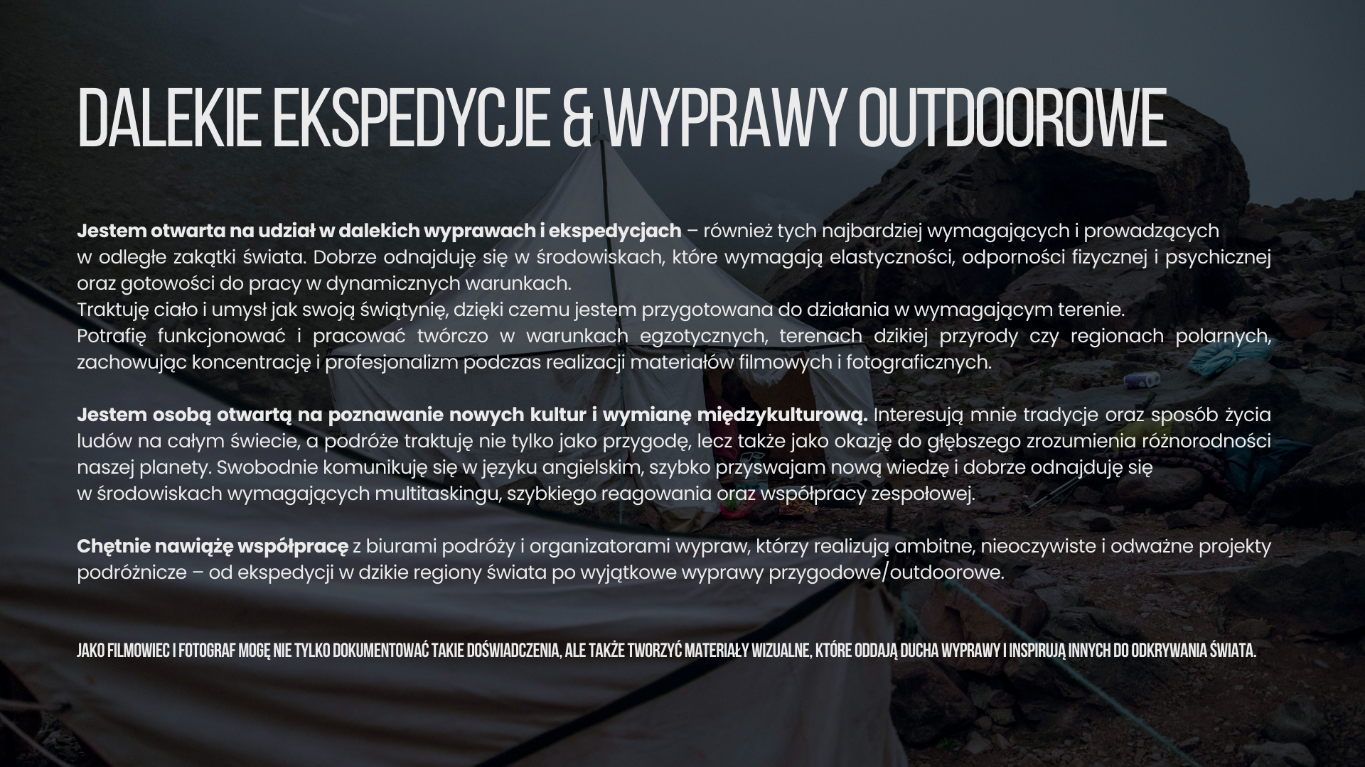 FOTOGRAFIA EVENTOWA | PODRÓŻNICZA | ADVENTURE Specjalizuję się w fotografii eventowej, podróżniczej oraz adventure, dokumentując wydarzenia, wyprawy i projekty w sposób autentyczny i pełen energii. Interesuje mnie uchwycenie nie tylko samego wydarzenia, ale przede wszystkim jego atmosfery, emocji i historii, które tworzą jego unikalny charakter. Szczególnie cenię sobie długofalowe współprace oparte na wzajemnym zaufaniu oraz wspólnych celach. Dzięki temu mogę jeszcze lepiej zrozumieć potrzeby partnerów i tworzyć spójne, wartościowe materiały wizualne, które wspierają rozwój ich projektów i marek.